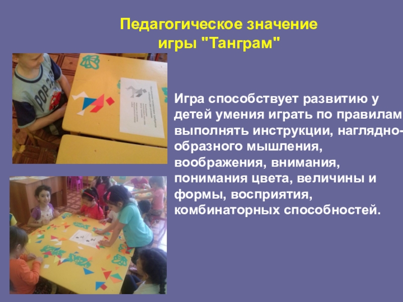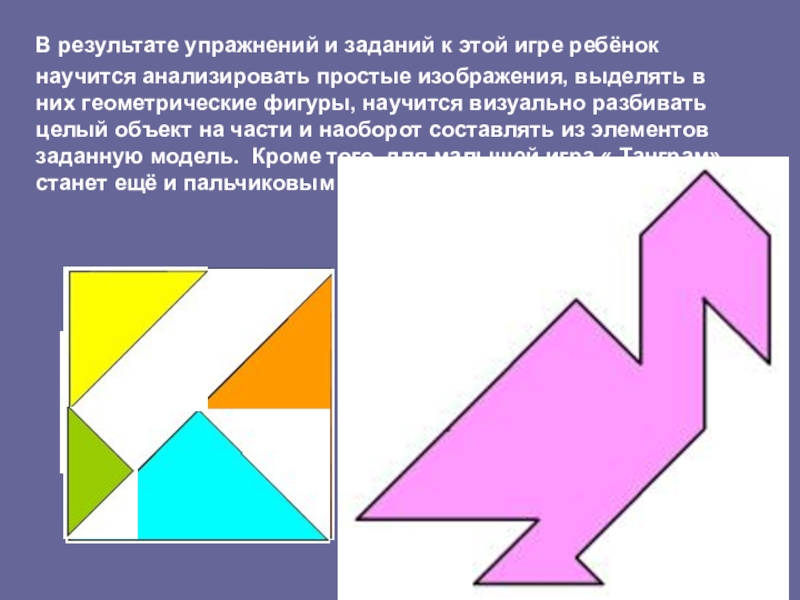 простые изображения, выделять в них геометрические фигуры, научится визуально разбивать целый объект на части и наоборот составлять из элементов заданную модель. Кроме того, для малышей игра « Танграм» станет ещё и пальчиковым тренажером.