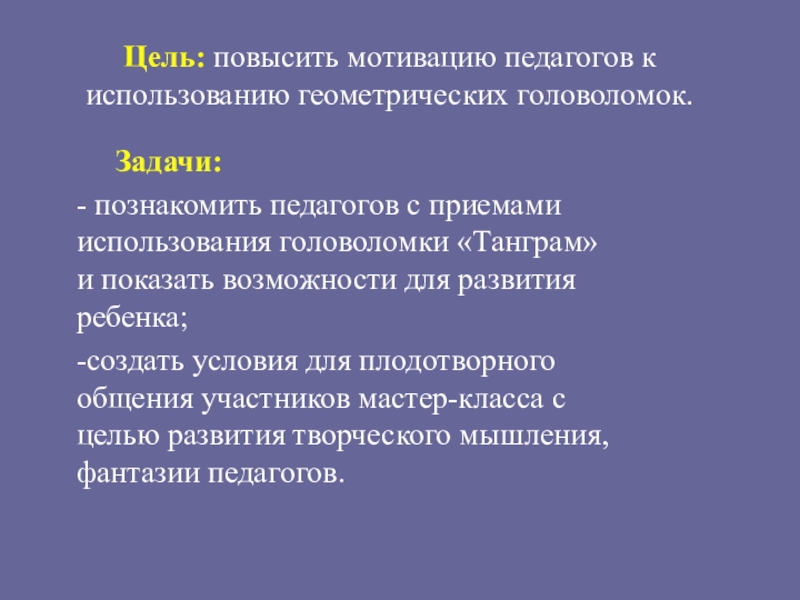 Слайд 2Цель: повысить мотивацию педагогов к использованию геометрических головоломок.
