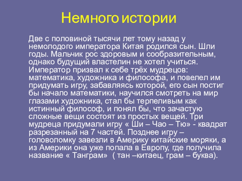 Китая родился сын. Шли годы. Мальчик рос здоровым и сообразительным, однако будущий властелин не хотел учиться. Император призвал к себе трёх мудрецов: математика, художника и философа, и повелел им придумать игру, забавляясь которой, его сын постиг бы начало математики, научился смотреть на мир глазами художника, стал бы терпеливым как истинный философ, и понял бы, что зачастую сложные вещи состоят из простых вещей. Три мудреца придумали игру « Ши – Чао – Тю» - квадрат разрезанный на 7 частей. Позднее игру – головоломку завезли в Америку китайские моряки, а из Америки она уже попала в Европу, где получила название « Танграм» ( тан –китаец, грам – буква).