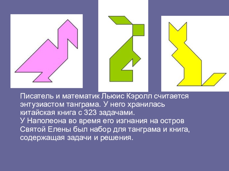 Слайд 6Писатель и математик Льюис Кэролл считается энтузиастом танграма. У него хранилась
