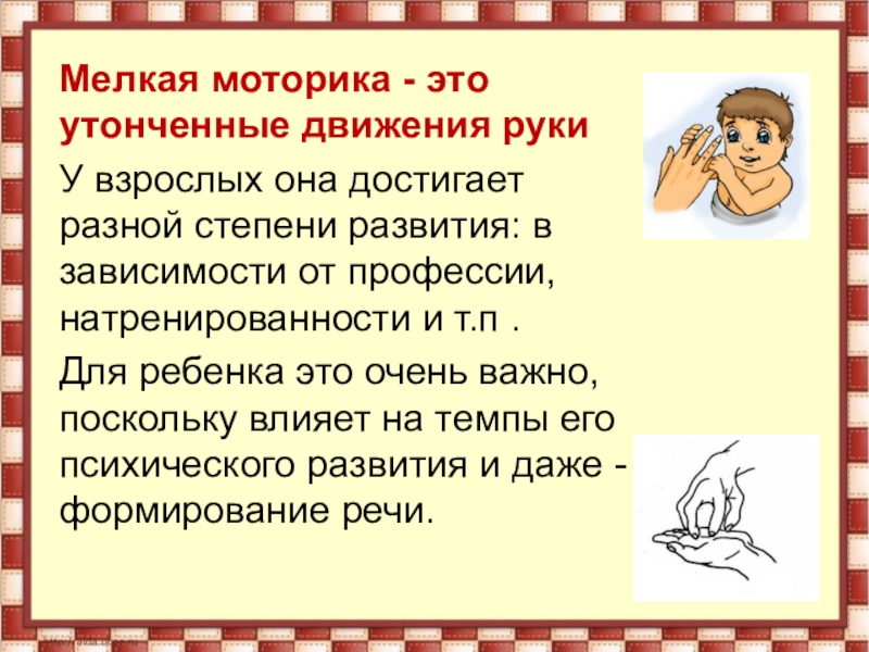 Слайд 3Мелкая моторика - это утонченные движения руки