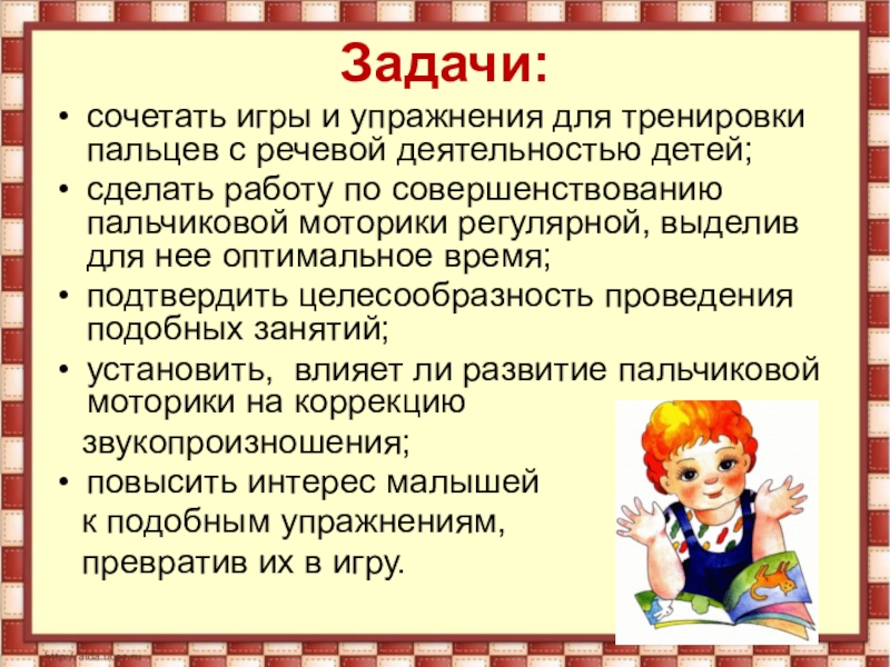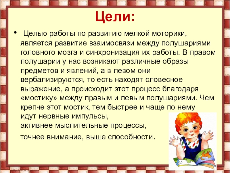 Целью работы по развитию мелкой моторики, является развитие взаимосвязи