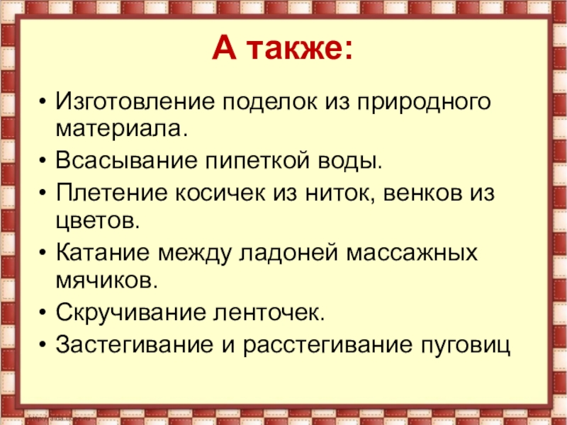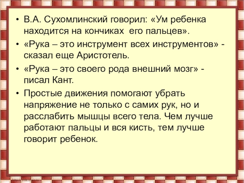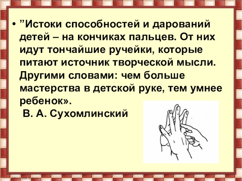 Слайд 2”Истоки способностей и дарований детей – на кончиках пальцев. От них