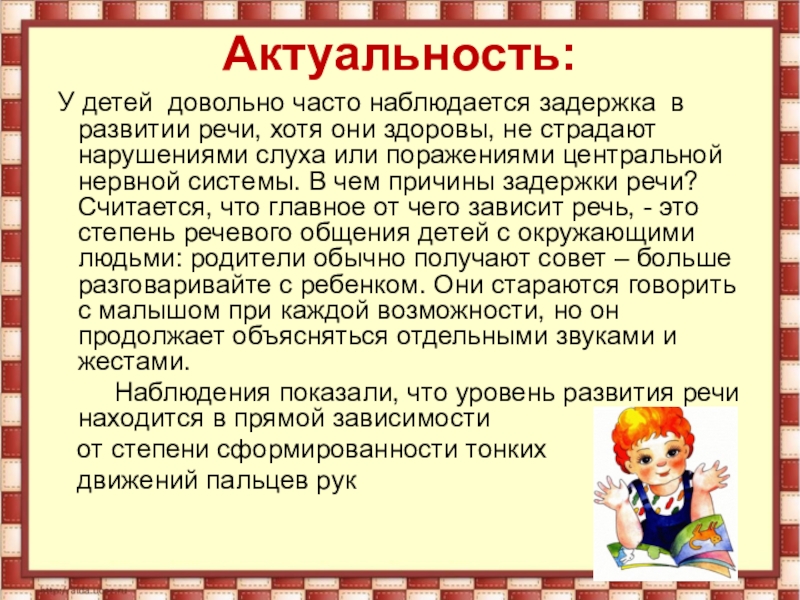 они здоровы, не страдают нарушениями слуха или поражениями центральной нервной системы. В чем причины задержки речи? Считается, что главное от чего зависит речь, - это степень речевого общения детей с окружающими людьми: родители обычно получают совет – больше разговаривайте с ребенком. Они стараются говорить с малышом при каждой возможности, но он продолжает объясняться отдельными звуками и жестами.