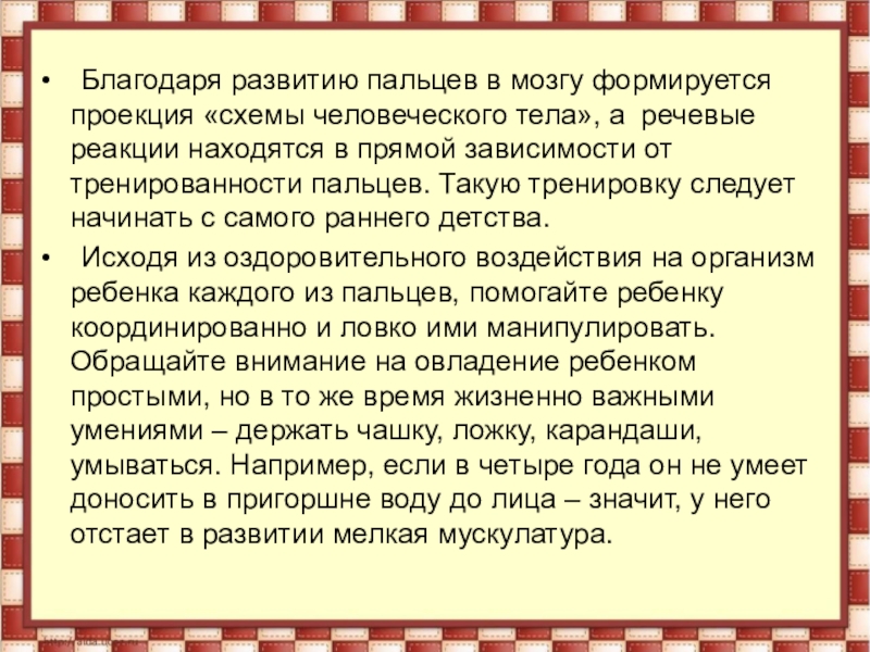 Слайд 4 Благодаря развитию пальцев в мозгу формируется проекция «схемы человеческого тела»,