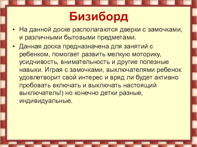 Данная доска предназначена для занятий с ребенком, помогает развить мелкую моторику, усидчивость, внимательность и другие полезные навыки. Играя с замочками, выключателями ребенок удовлетворит свой интерес и вряд ли будет активно пробовать включать и выключать настоящий выключатель!) но конечно детки разные, индивидуальные.