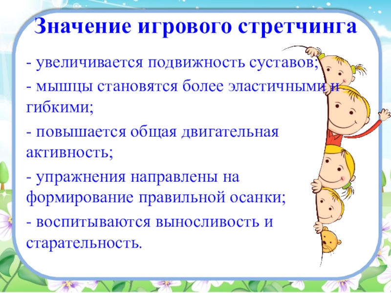 Значение игрового стретчинга- увеличивается подвижность суставов;- мышцы становятся более эластичными и гибкими;- повышается общая двигательная активность;- упражнения