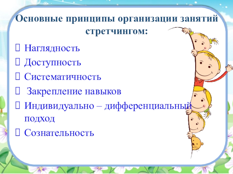 Основные принципы организации занятий стретчингом:Наглядность ДоступностьСистематичность Закрепление навыков Индивидуально – дифференциальный подход Сознательность
