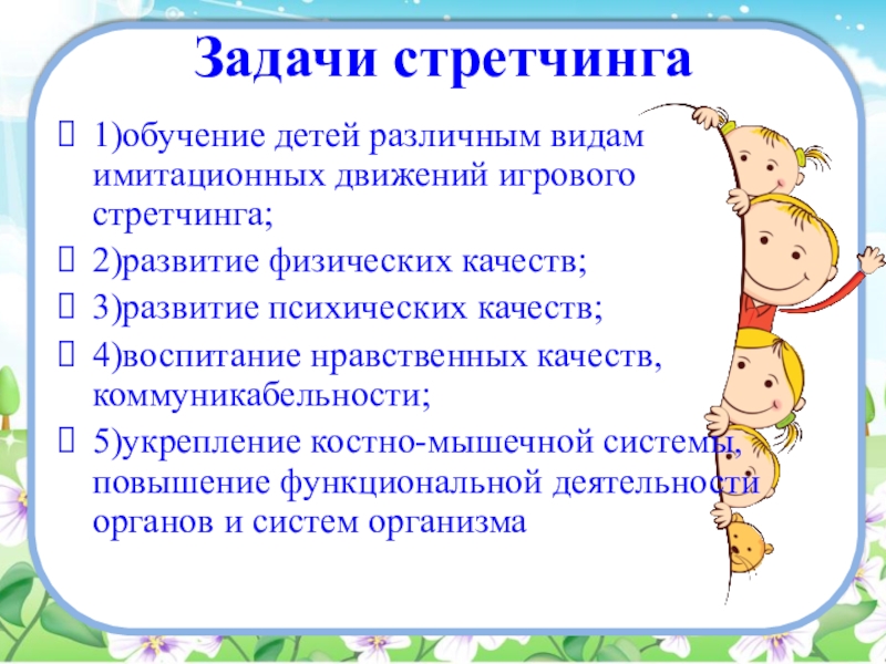 Задачи стретчинга1)обучение детей различным видам имитационных движений игрового стретчинга; 2)развитие физических качеств;3)развитие психических качеств;4)воспитание нравственных качеств, коммуникабельности;5)укрепление
