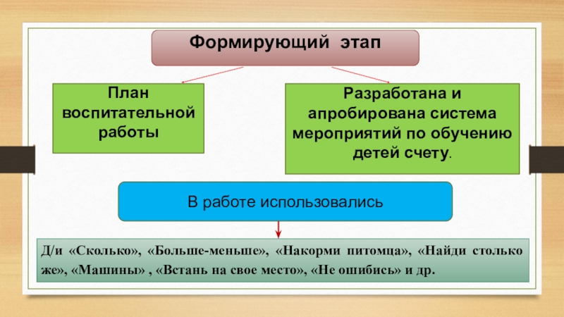 Д/и «Сколько», «Больше-меньше», «Накорми питомца», «Найди столько же», «Машины» , «Встань на свое место», «Не ошибись» и др.