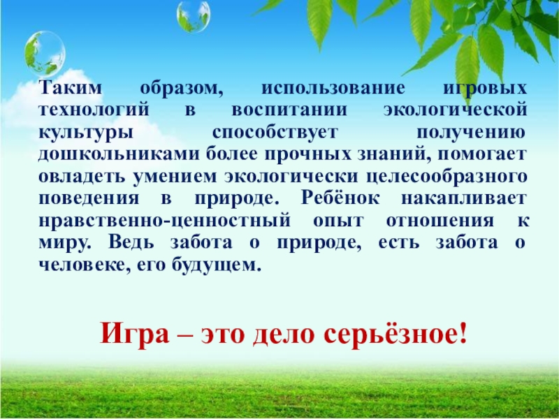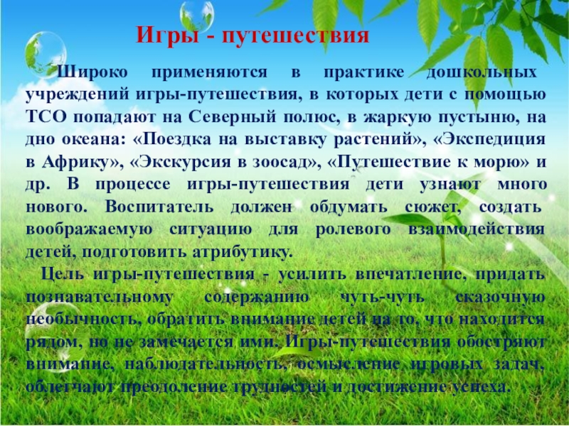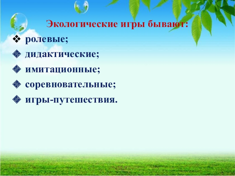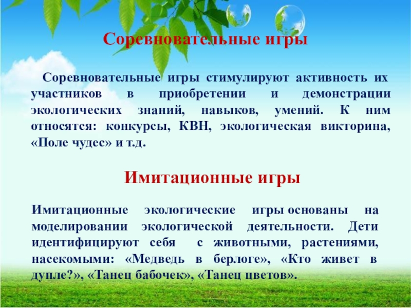 Имитационные экологические игры основаны на моделировании экологической деятельности. Дети идентифицируют себя с животными, растениями, насекомыми: «Медведь в берлоге», «Кто живет в дупле?», «Танец бабочек», «Танец цветов».