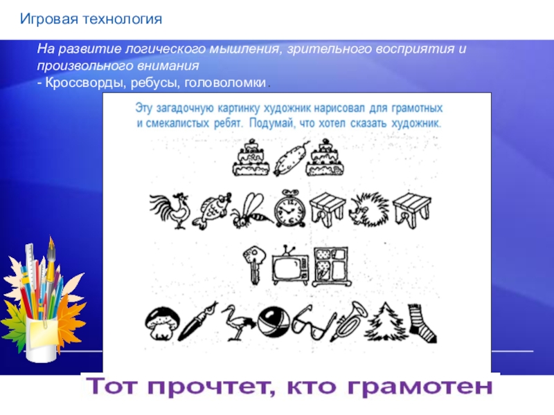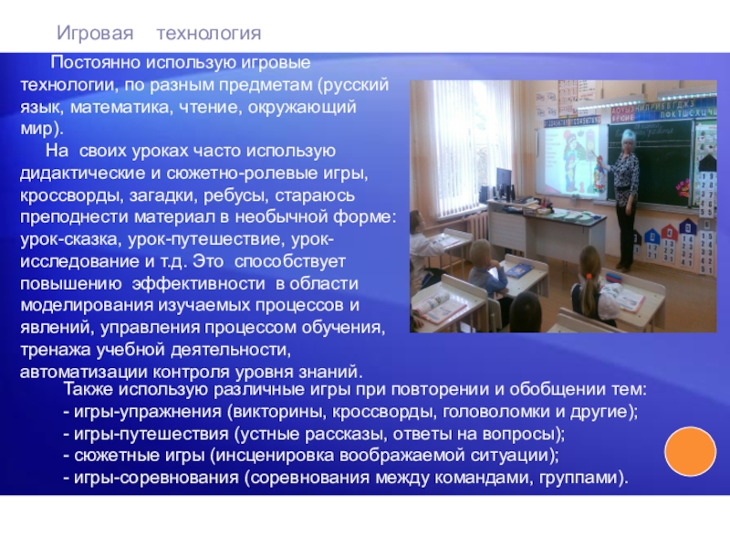 На своих уроках часто использую дидактические и сюжетно-ролевые игры, кроссворды, загадки, ребусы, стараюсь преподнести материал в необычной форме: урок-сказка, урок-путешествие, урок-исследование и т.д. Это способствует повышению эффективности в области моделирования изучаемых процессов и явлений, управления процессом обучения, тренажа учебной деятельности, автоматизации контроля уровня знаний.