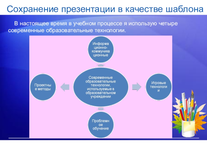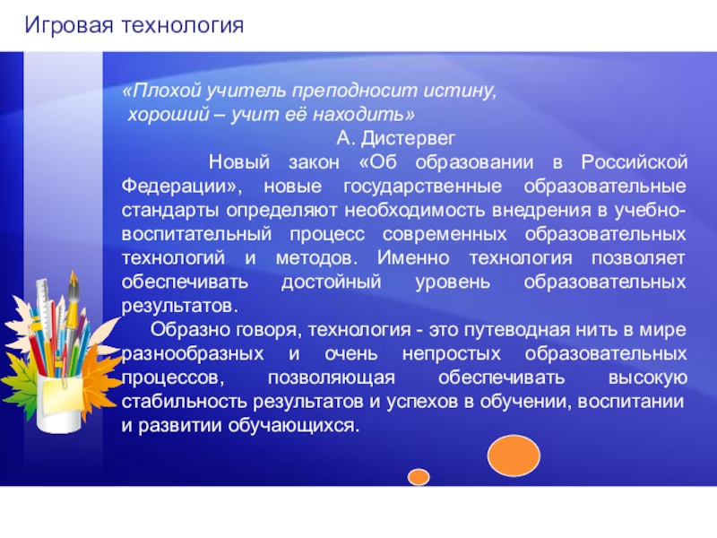 Новый закон «Об образовании в Российской Федерации», новые государственные образовательные стандарты определяют необходимость внедрения в учебно-воспитательный процесс современных образовательных технологий и методов. Именно технология позволяет обеспечивать достойный уровень образовательных результатов.