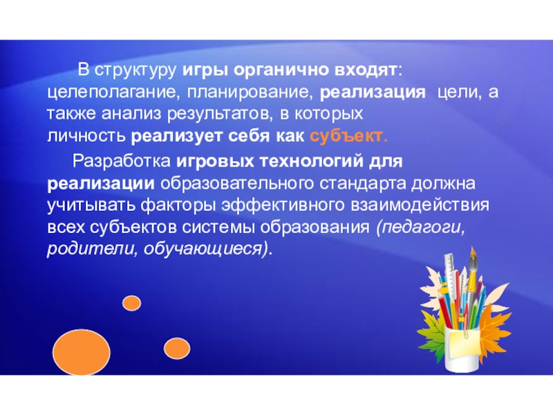 Слайд 9 В структуру игры органично входят: целеполагание, планирование, реализация