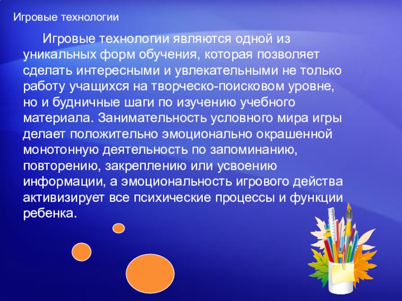 форм обучения, которая позволяет сделать интересными и увлекательными не только работу учащихся на творческо-поисковом уровне, но и будничные шаги по изучению учебного материала. Занимательность условного мира игры делает положительно эмоционально окрашенной монотонную деятельность по запоминанию, повторению, закреплению или усвоению информации, а эмоциональность игрового действа активизирует все психические процессы и функции ребенка.
