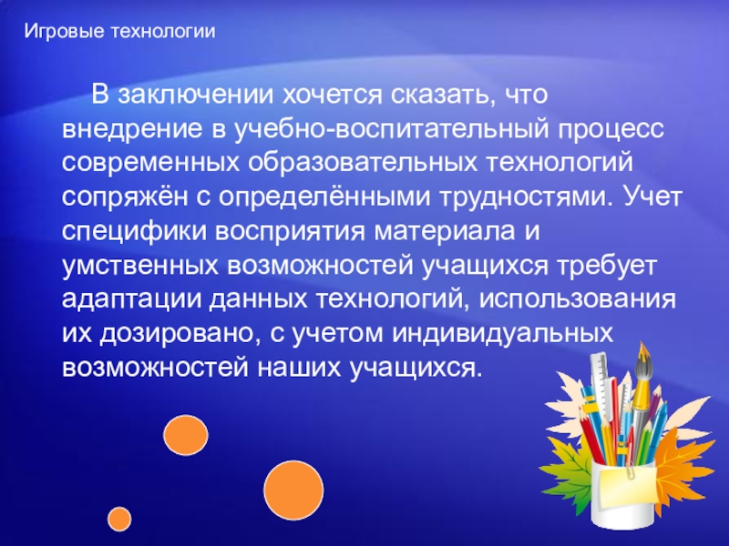 внедрение в учебно-воспитательный процесс современных образовательных технологий сопряжён с определёнными трудностями. Учет специфики восприятия материала и умственных возможностей учащихся требует адаптации данных технологий, использования их дозировано, с учетом индивидуальных возможностей наших учащихся.
