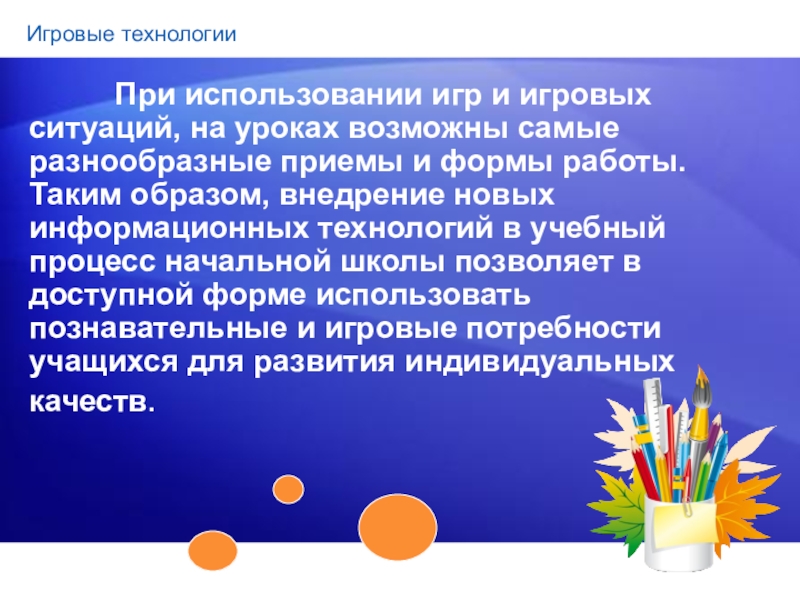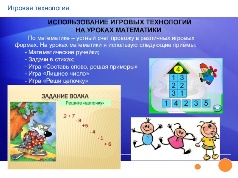 Постоянно использую игровые технологии, по разным предметам (русский язык, математика, чтение, окружающий мир).
