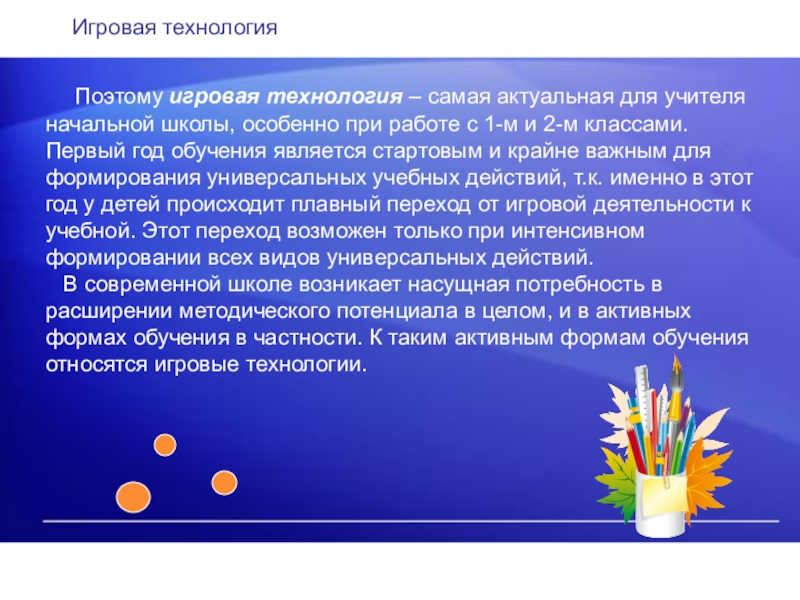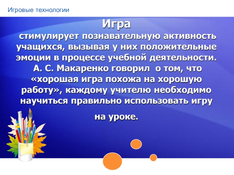 В современной школе возникает насущная потребность в расширении методического потенциала в целом, и в активных формах обучения в частности. К таким активным формам обучения относятся игровые технологии.