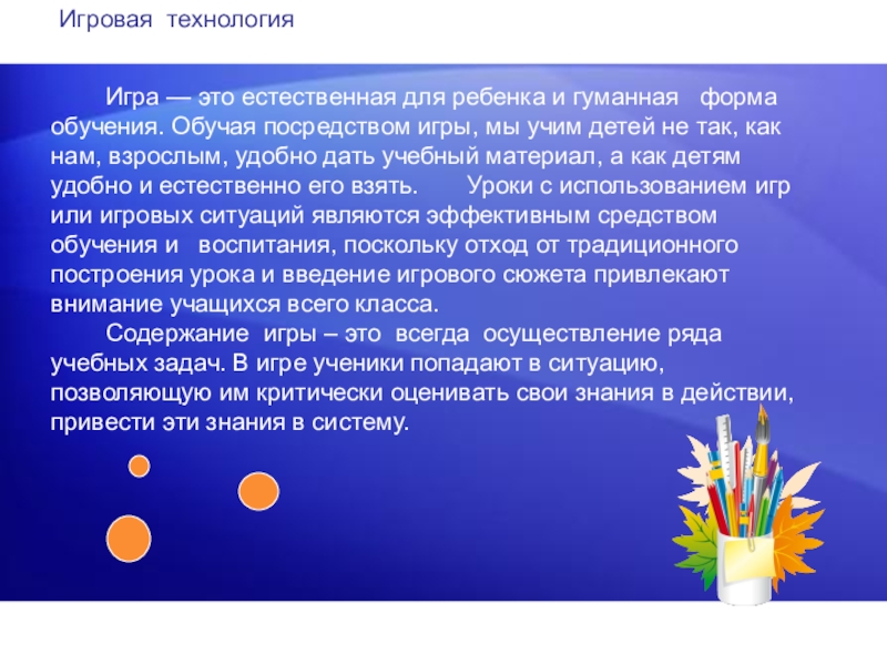 гуманная форма обучения. Обучая посредством игры, мы учим детей не так, как нам, взрослым, удобно дать учебный материал, а как детям удобно и естественно его взять. Уроки с использованием игр или игровых ситуаций являются эффективным средством обучения и воспитания, поскольку отход от традиционного построения урока и введение игрового сюжета привлекают внимание учащихся всего класса.