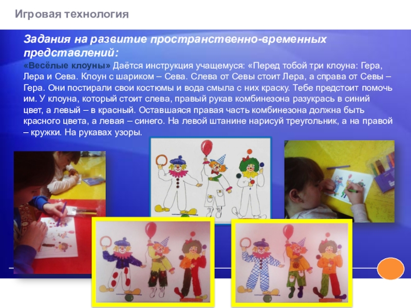 «Перед тобой три клоуна: Гера, Лера и Сева. Клоун с шариком – Сева. Слева от Севы стоит Лера, а справа от Севы – Гера. Они постирали свои костюмы и вода смыла с них краску. Тебе предстоит помочь им. У клоуна, который стоит слева, правый рукав комбинезона разукрась в синий цвет, а левый – в красный. Оставшаяся правая часть комбинезона должна быть красного цвета, а левая – синего. На левой штанине нарисуй треугольник, а на правой – кружки. На рукавах узоры.