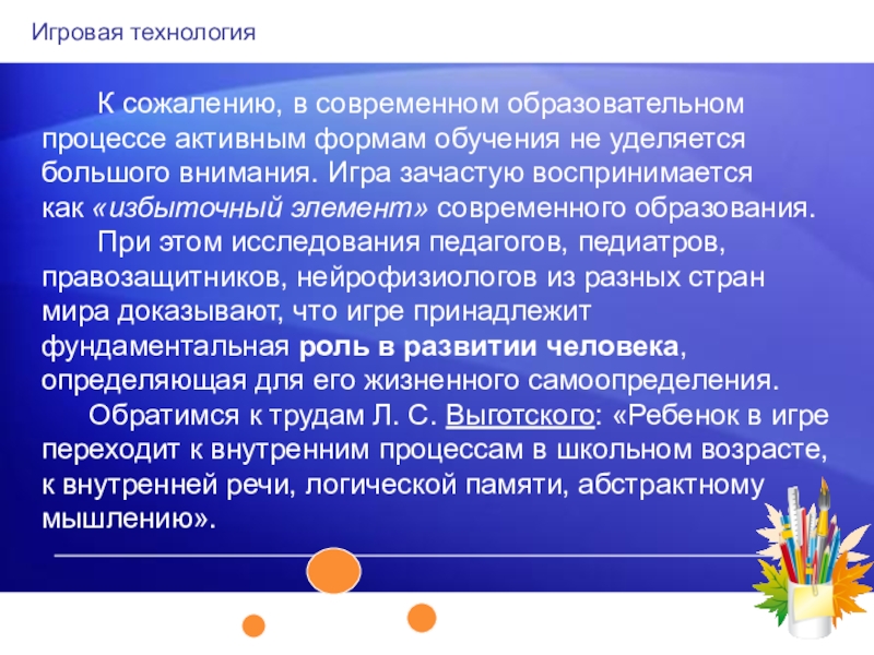 Обратимся к трудам Л. С. Выготского: «Ребенок в игре переходит к внутренним процессам в школьном возрасте, к внутренней речи, логической памяти, абстрактному мышлению».