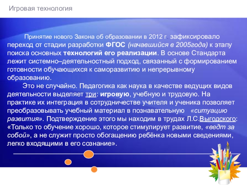 Это не случайно. Педагогика как наука в качестве ведущих видов деятельности выделяет три: игровую, учебную и трудовую. На практике их интеграция в сотрудничестве учителя и ученика позволяет преобразовывать учебный материал в познавательную «ситуацию развития». Подтверждение этого мы находим в трудах Л.С.Выгодского: «Только то обучение хорошо, которое стимулирует развитие, «ведт за собой», а не служит просто обогащению ребёнка новыми сведениями, легко входящими в его сознание».