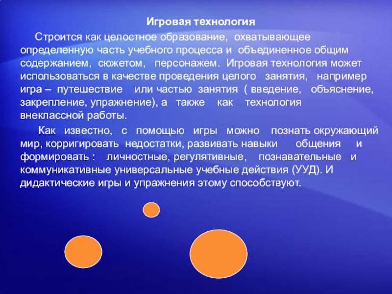 часть учебного процесса и объединенное общим содержанием, сюжетом, персонажем. Игровая технология может использоваться в качестве проведения целого занятия, например игра – путешествие или частью занятия ( введение, объяснение, закрепление, упражнение), а также как технология внеклассной работы.