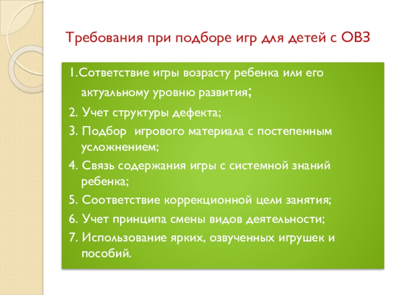 Слайд 6Требования при подборе игр для детей с ОВЗ