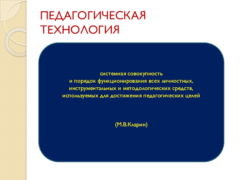 ПЕДАГОГИЧЕСКАЯ ТЕХНОЛОГИЯ системная совокупностьи порядок функционирования всех личностных,инструментальных и методологических средств,используемых для достижения педагогических целей(М.В.Кларин)