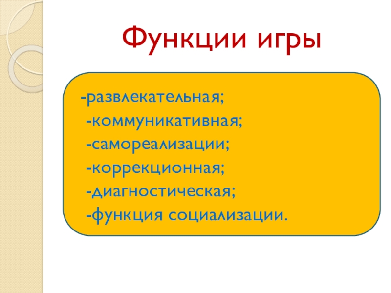 Функции игры  -развлекательная;  -коммуникативная;  -самореализации;  -коррекционная; -диагностическая; -функция социализации.