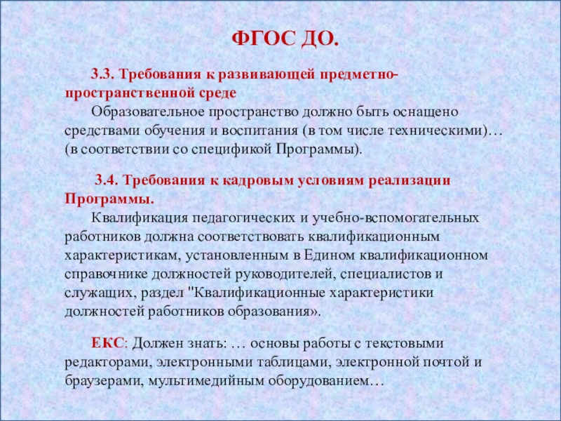 ЕКС: Должен знать: … основы работы с текстовыми редакторами, электронными таблицами, электронной почтой и браузерами, мультимедийным оборудованием…