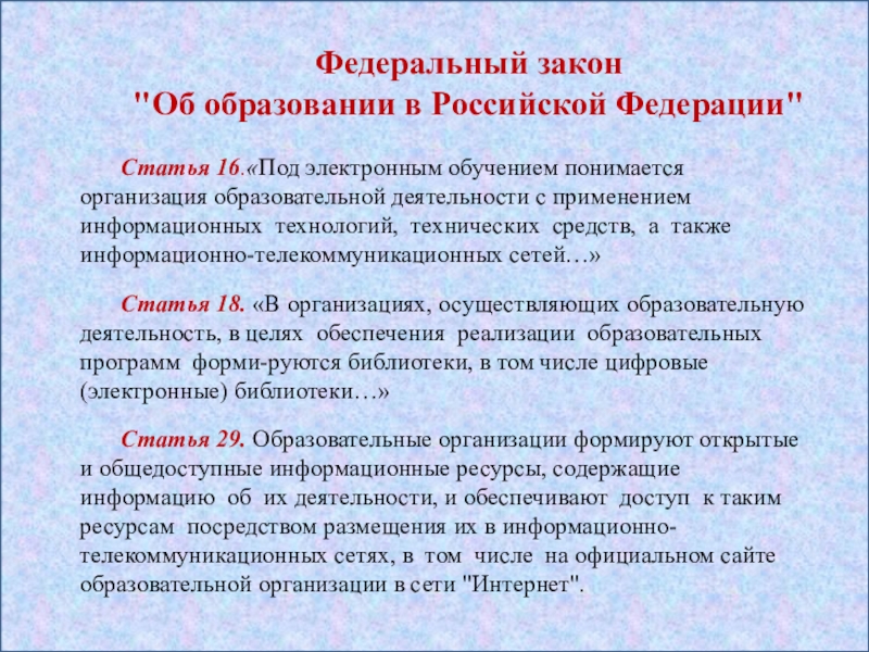 Статья 18. «В организациях, осуществляющих образовательную деятельность, в целях обеспечения реализации образовательных программ форми-руются библиотеки, в том числе цифровые (электронные) библиотеки…»