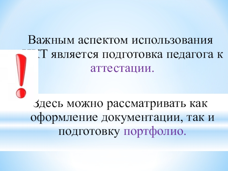 Слайд 7Важным аспектом использования ИКТ является подготовка педагога к аттестации.