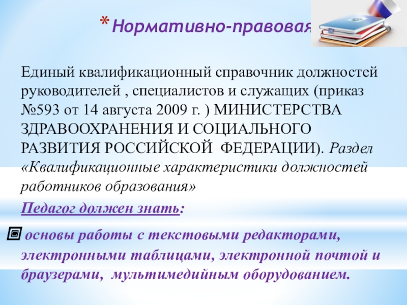 №593 от 14 августа 2009 г. ) МИНИСТЕРСТВА ЗДРАВООХРАНЕНИЯ И СОЦИАЛЬНОГО РАЗВИТИЯ РОССИЙСКОЙ ФЕДЕРАЦИИ). Раздел «Квалификационные характеристики должностей работников образования»