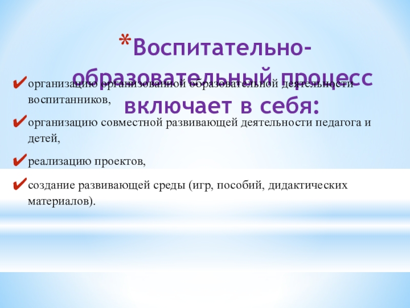 Слайд 8Воспитательно-образовательный процесс включает в себя:
