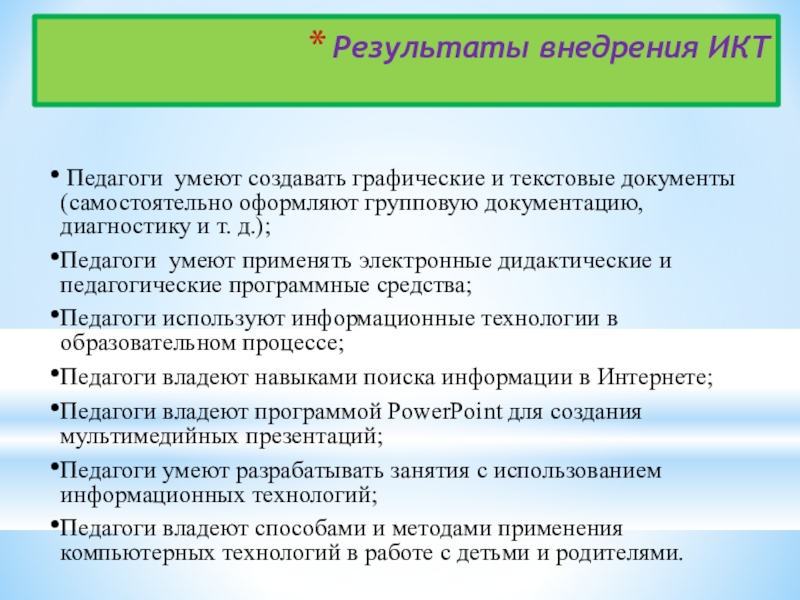 Педагоги умеют применять электронные дидактические и педагогические программные средства;