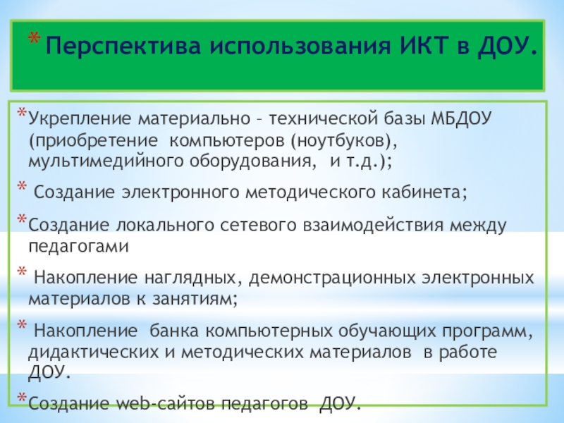 Слайд 13Перспектива использования ИКТ в ДОУ.