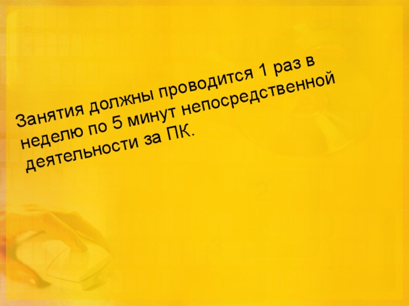 Занятия должны проводится 1 раз в неделю по 5 минут непосредственной деятельности за ПК.
