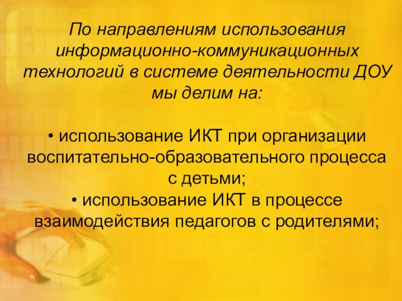 По направлениям использования информационно-коммуникационных технологий в системе деятельности ДОУ мы делим на:  • использование ИКТ при