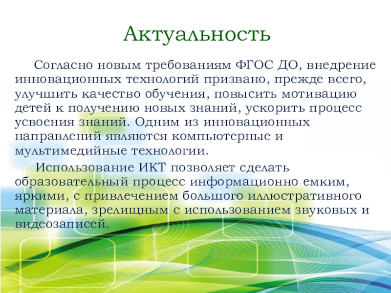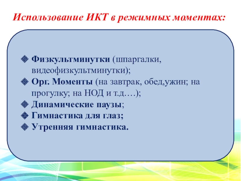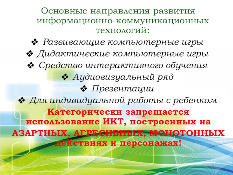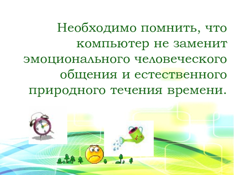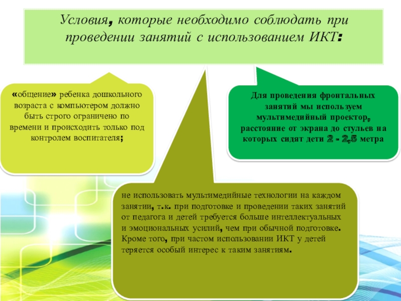 не использовать мультимедийные технологии на каждом занятии, т.к. при подготовке и проведении таких занятий от педагога и детей требуется больше интеллектуальных и эмоциональных усилий, чем при обычной подготовке. Кроме того, при частом использовании ИКТ у детей теряется особый интерес к таким занятиям.