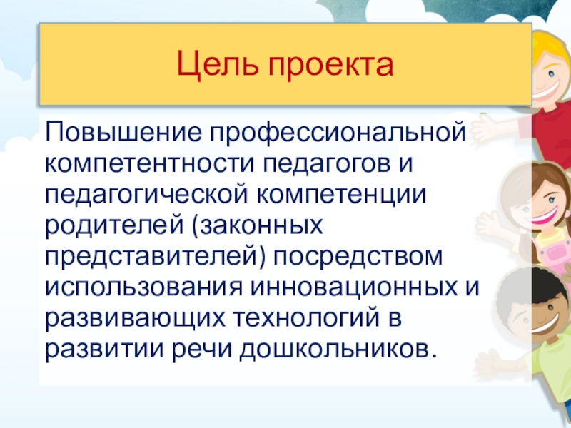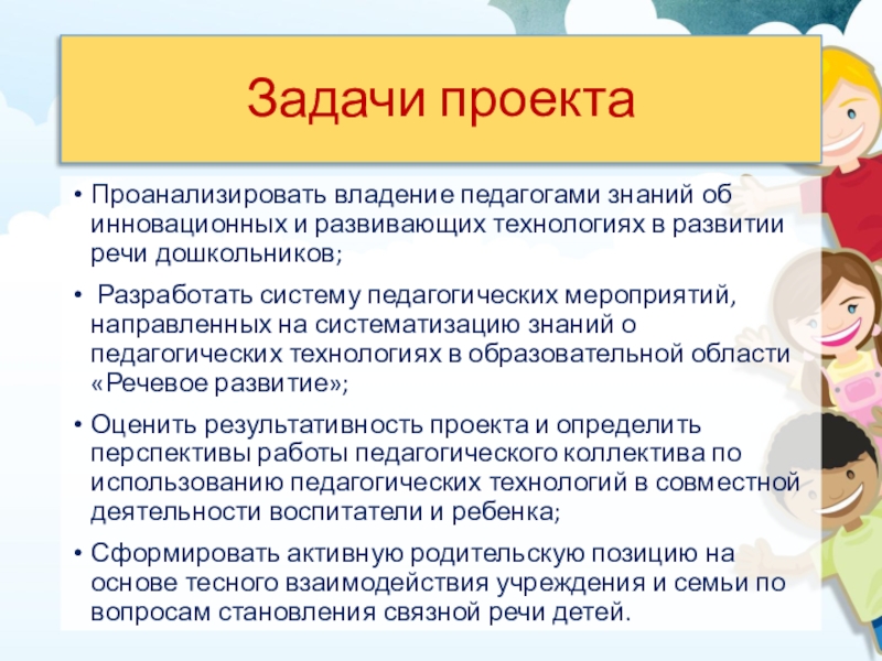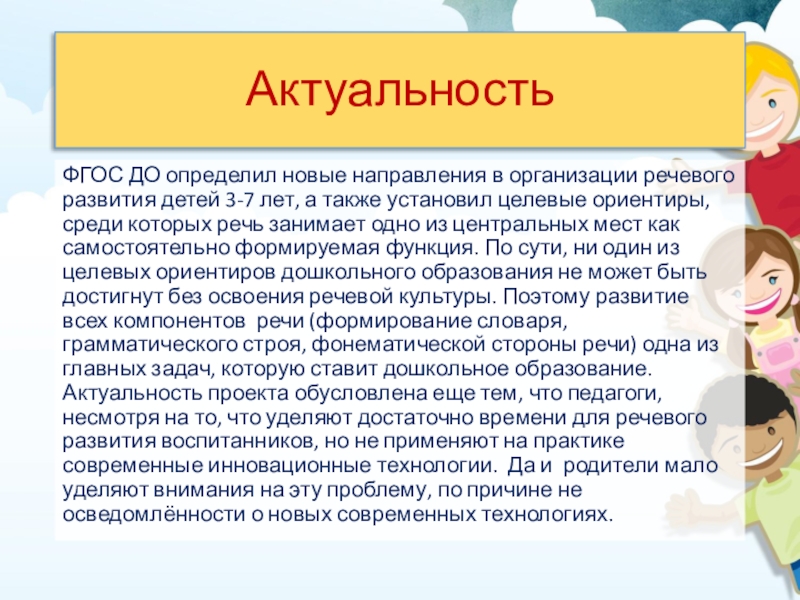 3-7 лет, а также установил целевые ориентиры, среди которых речь занимает одно из центральных мест как самостоятельно формируемая функция. По сути, ни один из целевых ориентиров дошкольного образования не может быть достигнут без освоения речевой культуры. Поэтому развитие всех компонентов речи (формирование словаря, грамматического строя, фонематической стороны речи) одна из главных задач, которую ставит дошкольное образование. Актуальность проекта обусловлена еще тем, что педагоги, несмотря на то, что уделяют достаточно времени для речевого развития воспитанников, но не применяют на практике современные инновационные технологии. Да и родители мало уделяют внимания на эту проблему, по причине не осведомлённости о новых современных технологиях.