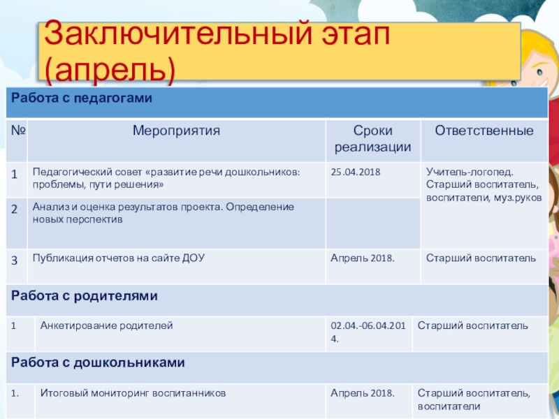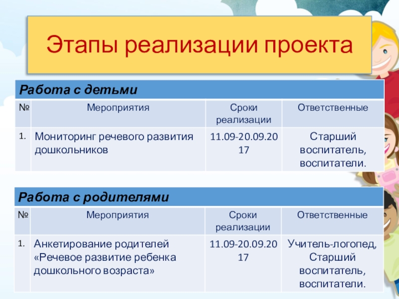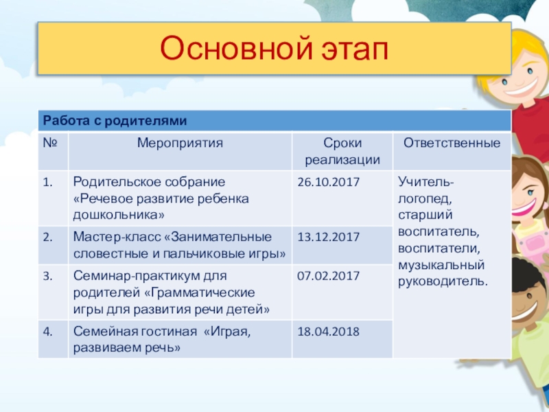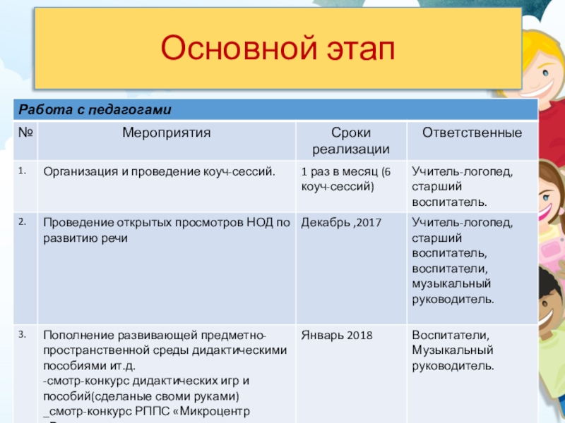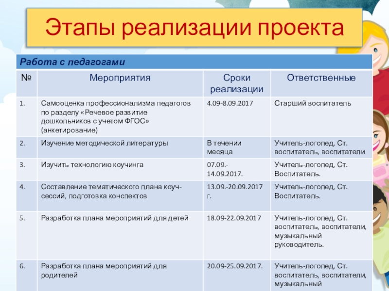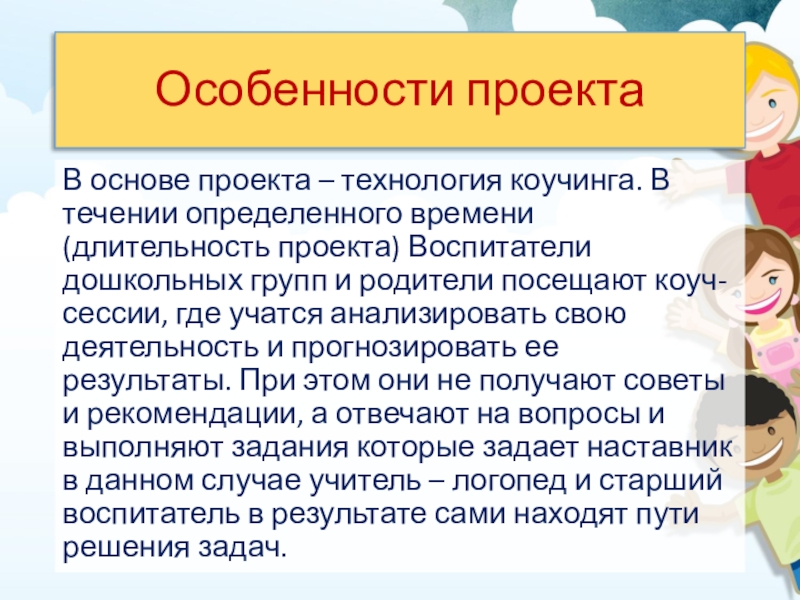 (длительность проекта) Воспитатели дошкольных групп и родители посещают коуч-сессии, где учатся анализировать свою деятельность и прогнозировать ее результаты. При этом они не получают советы и рекомендации, а отвечают на вопросы и выполняют задания которые задает наставник в данном случае учитель – логопед и старший воспитатель в результате сами находят пути решения задач.