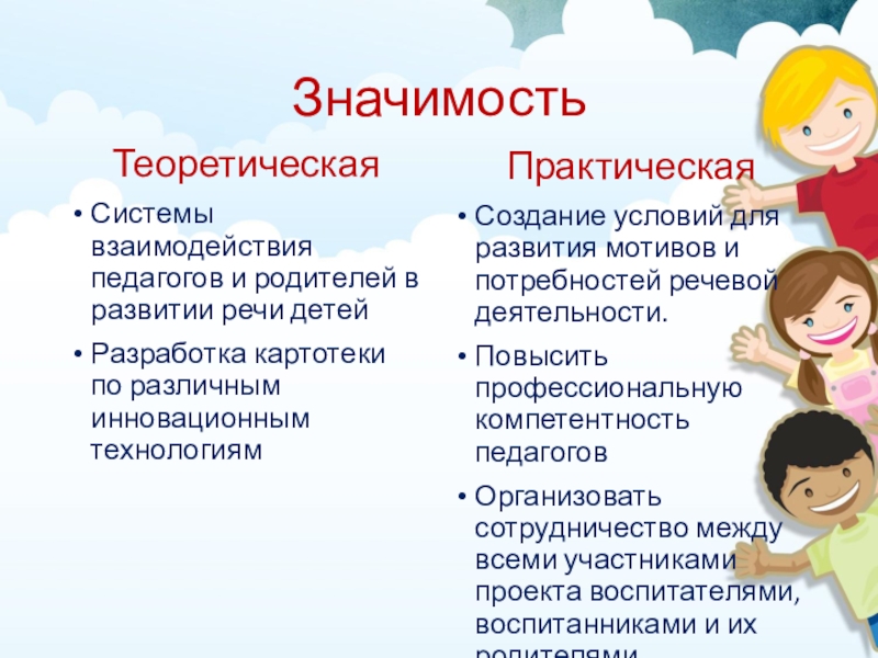 Участие родителей в проекте поможет им осознать свою роль в речевом развитии ребенка, изменить отношение к личности ребенка, характер общения с ним, а также повысит их педагогические знания.
