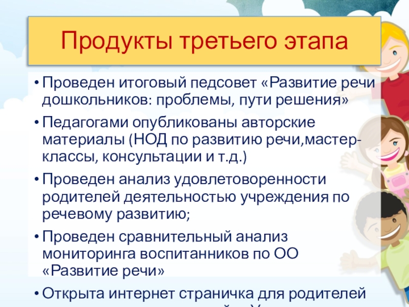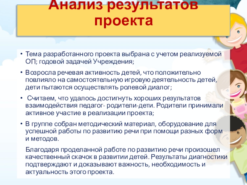 Благодаря проделанной работе по развитию речи произошел качественный скачок в развитии детей. Результаты диагностики подтверждают и доказывают важность, необходимость и актуальность этого проекта.