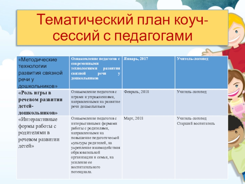 Составлен тематический план коуч-сессий, разработаны конспекты занятий с педагогами.