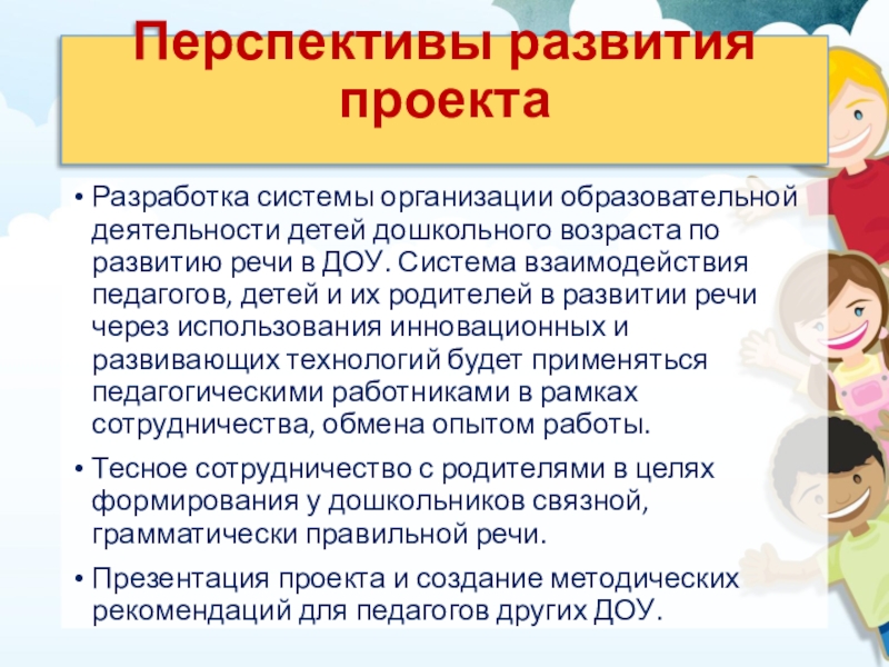 развитию речи в ДОУ. Система взаимодействия педагогов, детей и их родителей в развитии речи через использования инновационных и развивающих технологий будет применяться педагогическими работниками в рамках сотрудничества, обмена опытом работы.