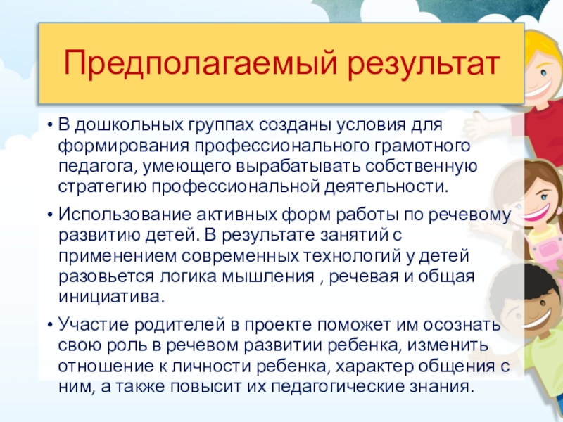 Использование активных форм работы по речевому развитию детей. В результате занятий с применением современных технологий у детей разовьется логика мышления , речевая и общая инициатива.
