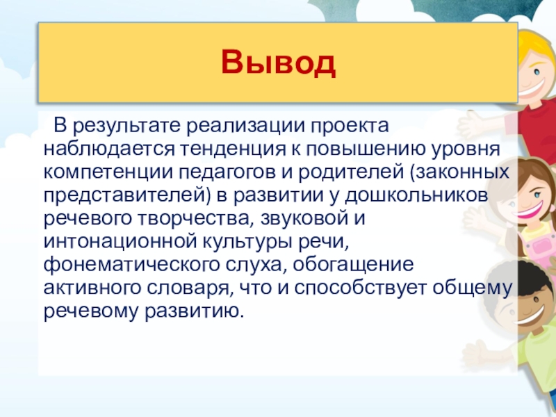 педагогов и родителей (законных представителей) в развитии у дошкольников речевого творчества, звуковой и интонационной культуры речи, фонематического слуха, обогащение активного словаря, что и способствует общему речевому развитию.