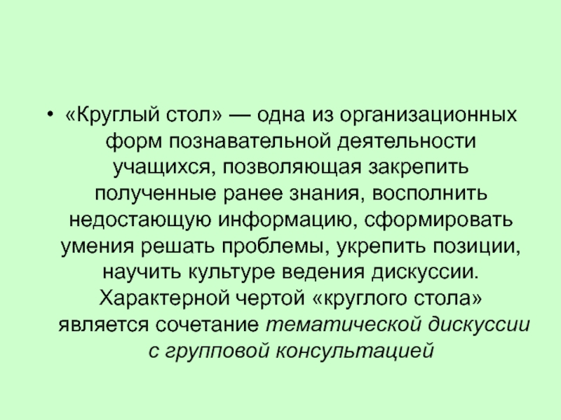полученные ранее знания, восполнить недостающую информацию, сформировать умения решать проблемы, укрепить позиции, научить культуре ведения дискуссии. Характерной чертой «круглого стола» является сочетание тематической дискуссии с групповой консультацией