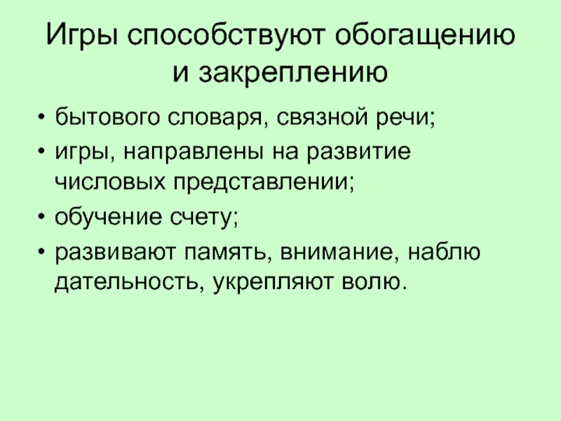 Слайд 8Игры способствуют обогащению и закреплению